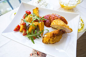 Unsere hauseigene Küche bietet Ihnen ein abwechslungsreiches Catering-Angebot für Ihre Veranstaltung. Von kalten und heißen Getränken, belegten Brötchen oder hausgebackenen Kuchen und Plätzchen für die kleine Pause zwischendurch über Fingerfood oder leckere Suppen bis hin zu abwechslungsreichen Tellergerichten oder Buffets für das Mittag- oder Abendessen. Wir sorgen dafür, dass Ihre Gäste kulinarisch bestens versorgt sind. Gerne berücksichtigen wir dabei auch spezielle Ernährungsbedürfnisse und -wünsche.